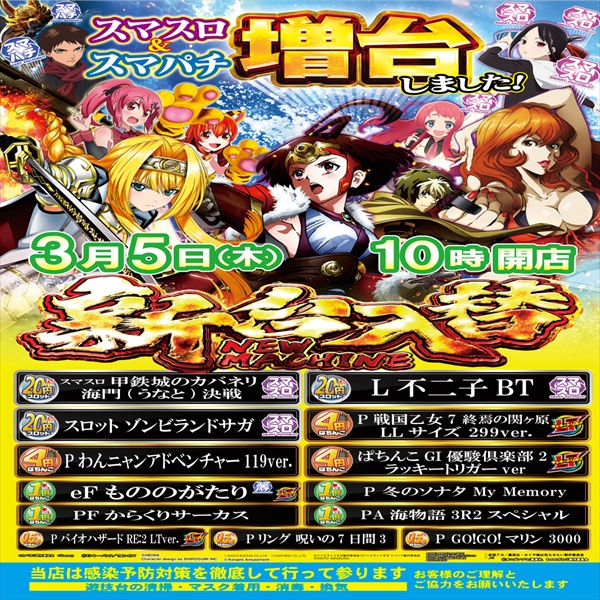 2026.03.03更新 3月4日水曜日。新台入替初日です! 10時開店です!!!皆様のご来店を心よりお待ちしております!!! 20円スロット:スマスロ甲鉄城のカバネリ~海門(うなと)決戦【スマスロ】、L不二子BT【スマスロ】、押忍!番長4【スマスロ】、 5円スロット:回胴式遊技機 グランベルム、 4円ぱちんこ: e ノーゲーム・ノーライフ 199Ver.【スマパチ・ラッキートリガー】、e 聖戦士ダンバイン3 ZEROSONIC【スマパチ・ラッキートリガー】、 1円ぱちんこ:eFからくりサーカス2 魔王ver.【スマパチ・ラッキートリガー】、e Re:ゼロから始める異世界生活 season2【スマパチ】、 10円スロット: スマスロ モンスターハンターライズ【スマスロ】、スマスロ シャーマンキング【スマスロ】、【増台】スマスロ北斗の拳【スマスロ】、
