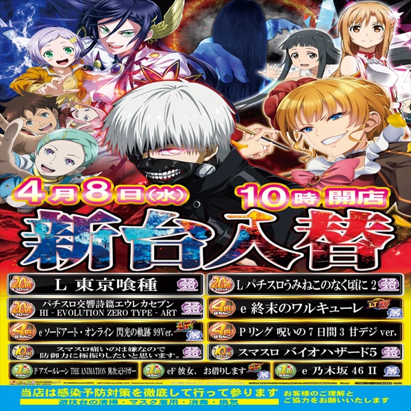 2026.03.04更新 蛍池店3月5日木曜日新台入替初日です。 ★スマスロ・スマパチ増台しました★ 10時開店です。皆様のご来店を心よりお待ちしております! 20円スロット:スマスロ 甲鉄城のカバネリ 海門(うなと)決戦【スマスロ】、L不二子BT【スマスロ】、スロット ゾンビランドサガ【スマスロ】、 4円ぱちんこ:P戦国乙女7 終焉の関ヶ原 LLサイズ 299ver.【ラッキートリガー】、Pわんニャンアドベンチャー119ver.、ぱちんこGI優駿倶楽部2ラッキートリガーver【ラッキートリガー】、 1円ぱちんこ:eFもののがたり【スマスロ・ラッキートリガー】、P 冬のソナタ My Memory、PFからくりサーカス、PA海物語3R2スペシャル、 0.5円ぱちんこ:Pバイオハザード RE:2 LTver.【ラッキートリガー】、Pリング 呪いの7日間3、P GO!GO!マリン 3000、
